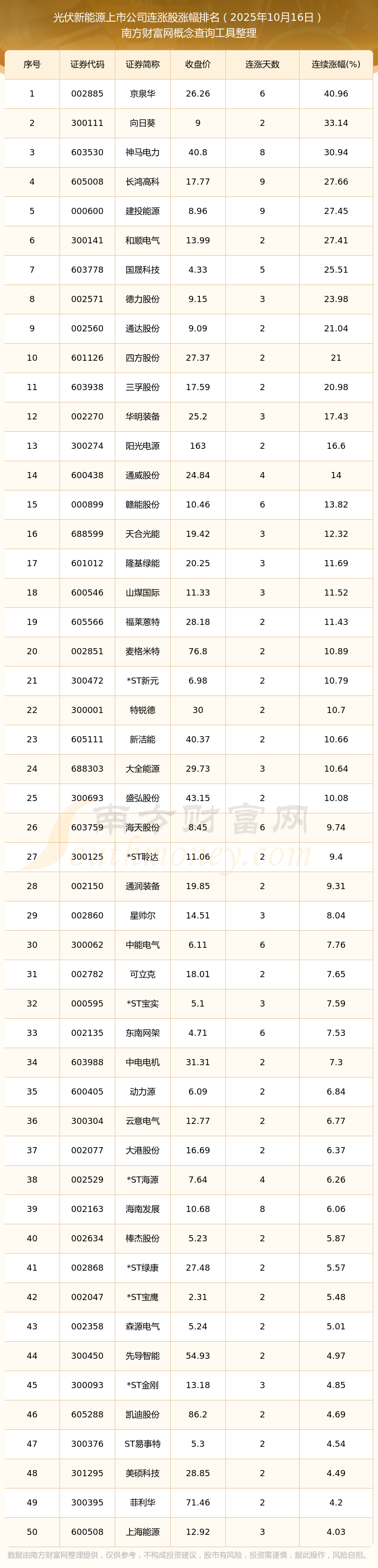 2025年10月16日光伏新能源上市公司連漲股漲幅排名