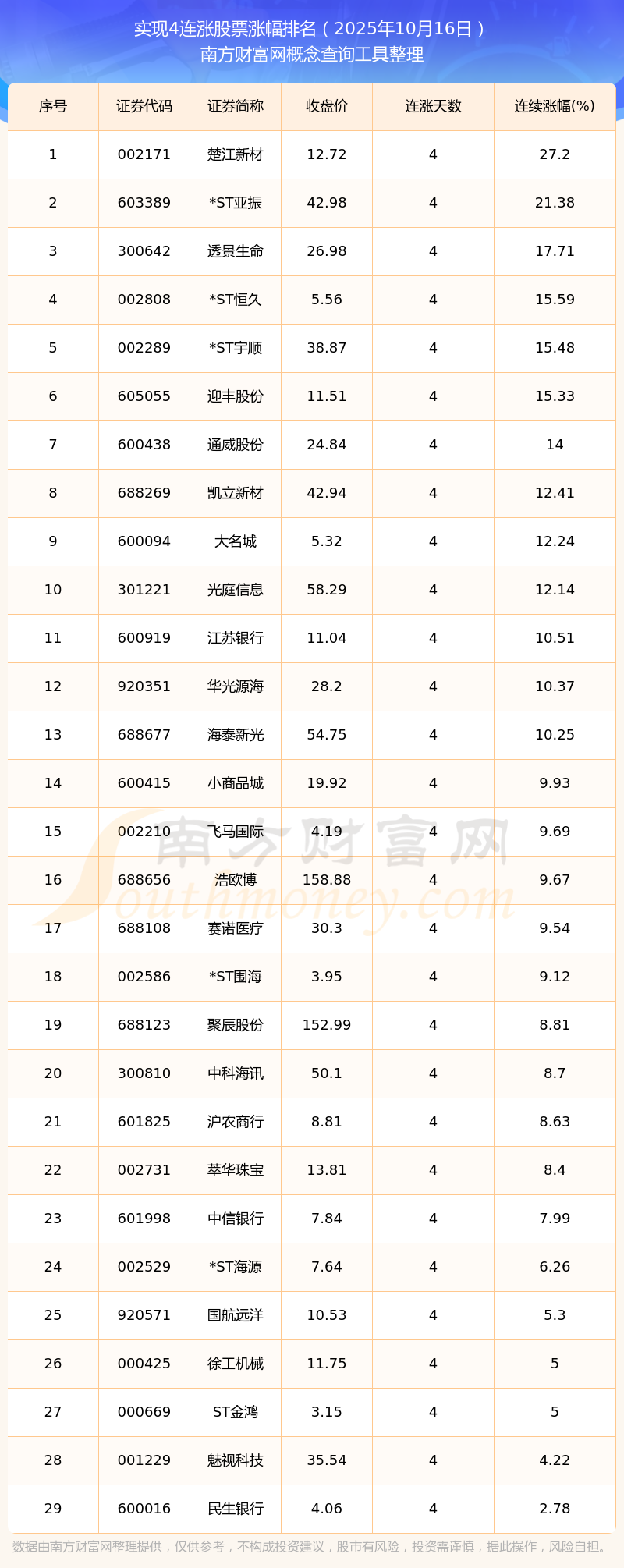 2025年10月16日實(shí)現(xiàn)4連漲股票漲幅排名