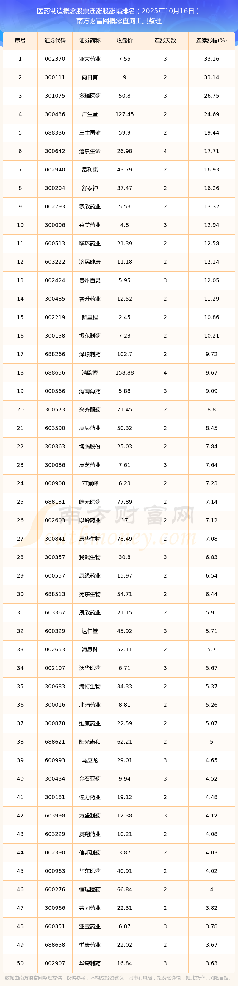 2025年10月16日醫(yī)藥制造概念股票連漲股漲幅排名