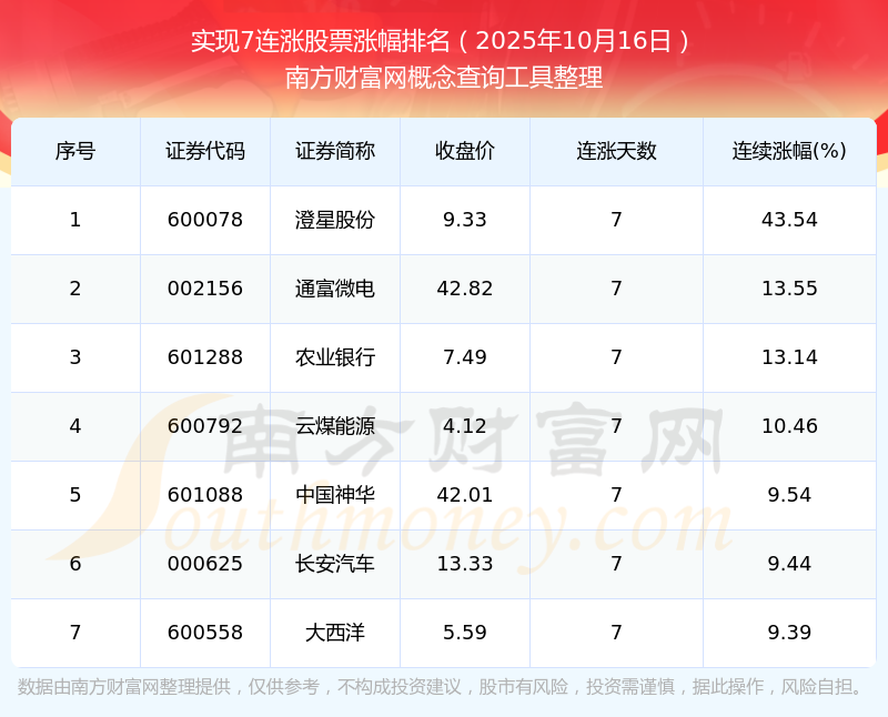 2025年10月16日實(shí)現(xiàn)7連漲股票漲幅排名