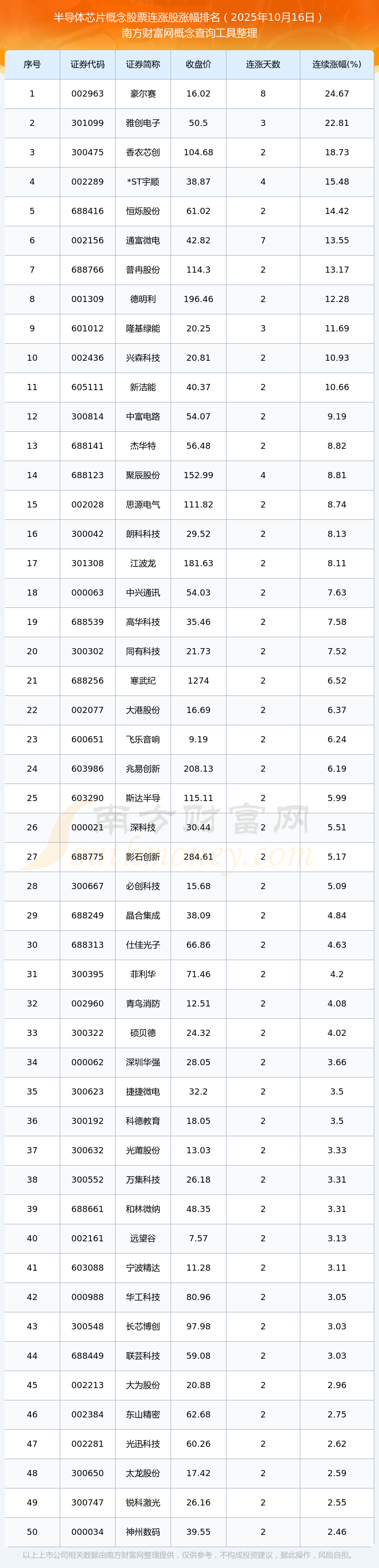 2025年10月16日半導(dǎo)體芯片概念股票連漲股漲幅排名