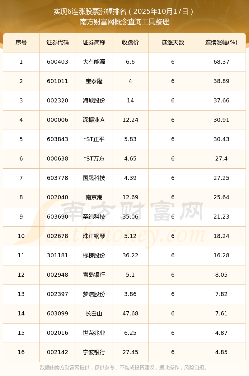 2025年10月17日實(shí)現(xiàn)6連漲股票漲幅排名