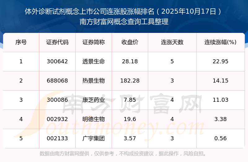 2025年10月17日體外診斷試劑概念上市公司連漲股漲幅排名