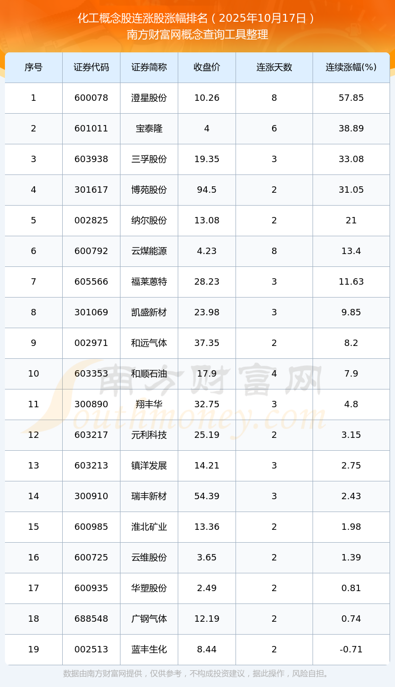 根據(jù)南方財富網(wǎng)概念查詢工具數(shù)據(jù)統(tǒng)計,截止2025年10月17日收盤,化工概念股共有19只個股實現(xiàn)連漲。其中連續(xù)漲幅較大的個股有澄星股份、寶泰隆、三孚股份等,連續(xù)漲幅分別為57.85%、38.89%、33.08%。