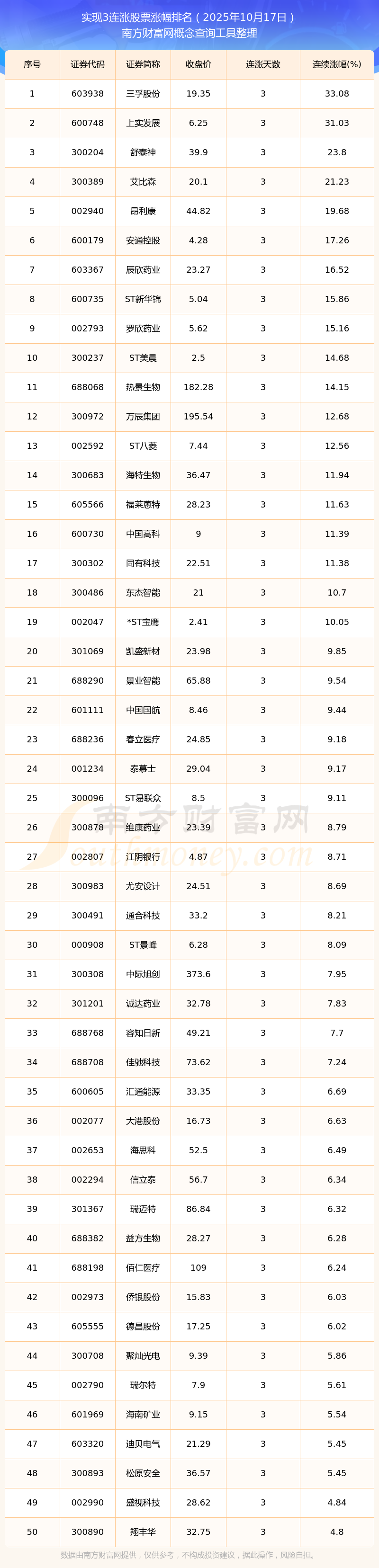 根據(jù)南方財(cái)富網(wǎng)概念查詢(xún)工具數(shù)據(jù)統(tǒng)計(jì),截止2025年10月17日收盤(pán),共有75只個(gè)股實(shí)現(xiàn)3天連漲。其中連續(xù)漲幅較大的個(gè)股有三孚股份、上實(shí)發(fā)展、舒泰神等,連續(xù)漲幅分別為33.08%、31.03%、23.80%。