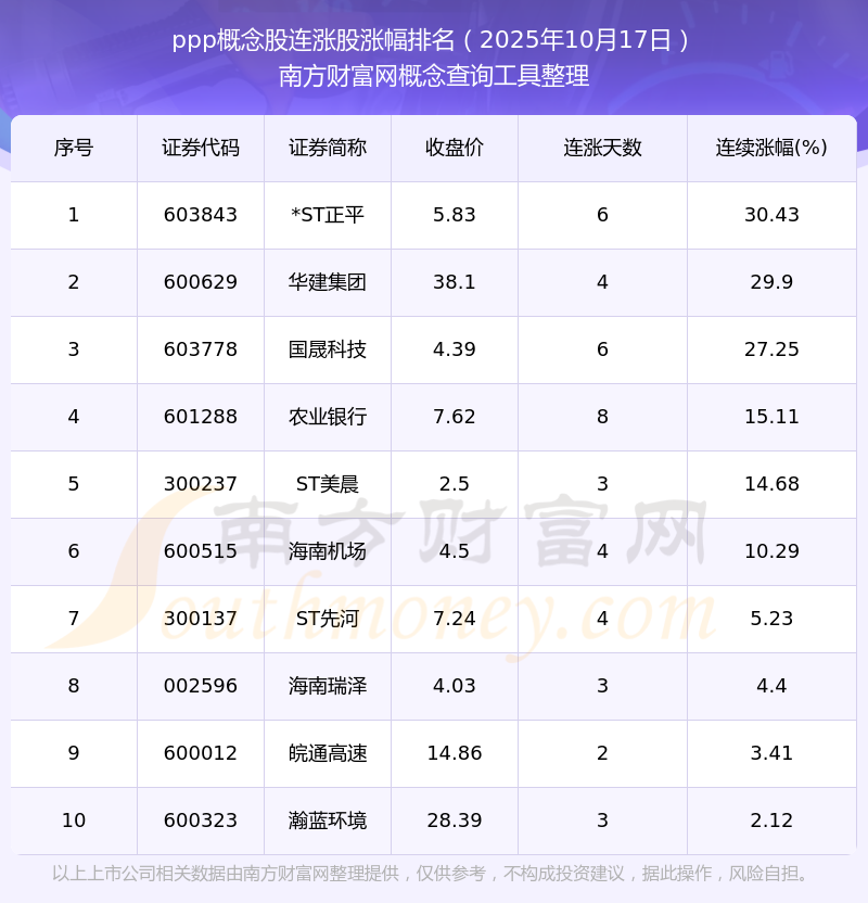 根據(jù)南方財富網(wǎng)概念查詢工具數(shù)據(jù)統(tǒng)計,截止2025年10月17日收盤,ppp概念股共有10只個股實現(xiàn)連漲。其中連續(xù)漲幅較大的個股有*ST正平、華建集團、國晟科技等,連續(xù)漲幅分別為30.43%、29.90%、27.25%。