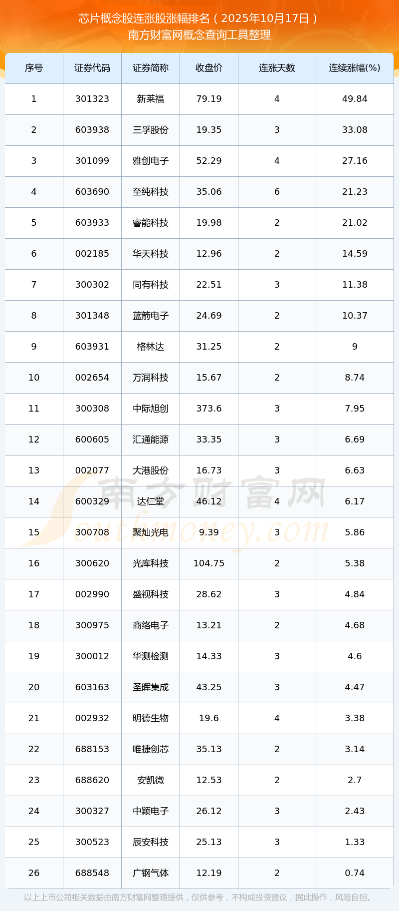 根據(jù)南方財(cái)富網(wǎng)概念查詢工具數(shù)據(jù)統(tǒng)計(jì),截止2025年10月17日收盤,芯片概念股共有26只個(gè)股實(shí)現(xiàn)連漲。其中連續(xù)漲幅較大的個(gè)股有新萊福、三孚股份、雅創(chuàng)電子等,連續(xù)漲幅分別為49.84%、33.08%、27.16%。