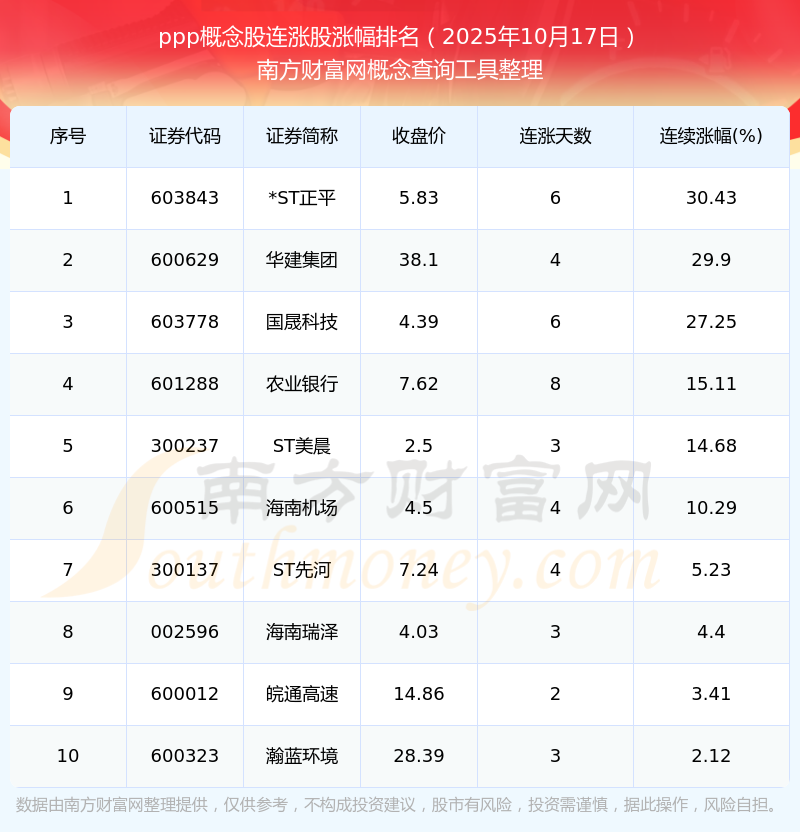 根據(jù)南方財富網(wǎng)概念查詢工具數(shù)據(jù)統(tǒng)計,截止2025年10月17日收盤,ppp概念股共有10只個股實現(xiàn)連漲。其中連續(xù)漲幅較大的個股有*ST正平、華建集團(tuán)、國晟科技等,連續(xù)漲幅分別為30.43%、29.90%、27.25%。