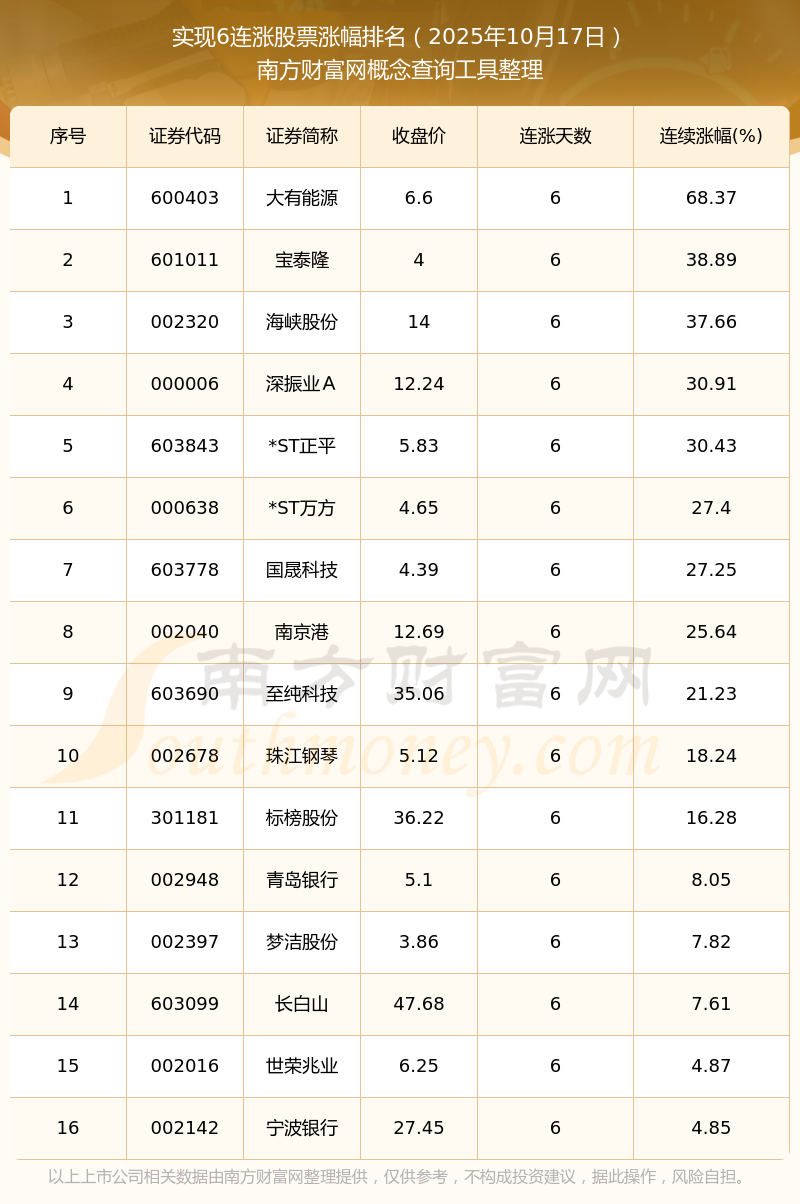 根據(jù)南方財富網(wǎng)概念查詢工具數(shù)據(jù)統(tǒng)計,截止2025年10月17日收盤,共有16只個股實現(xiàn)6天連漲。其中連續(xù)漲幅較大的個股有大有能源、寶泰隆、海峽股份等,連續(xù)漲幅分別為68.37%、38.89%、37.66%。