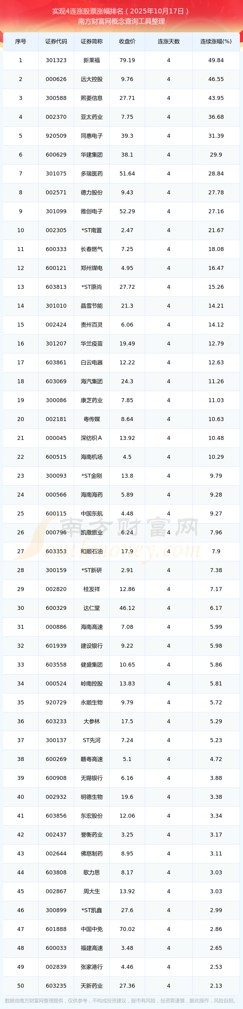 2025年10月17日實現(xiàn)4連漲股票漲幅排名