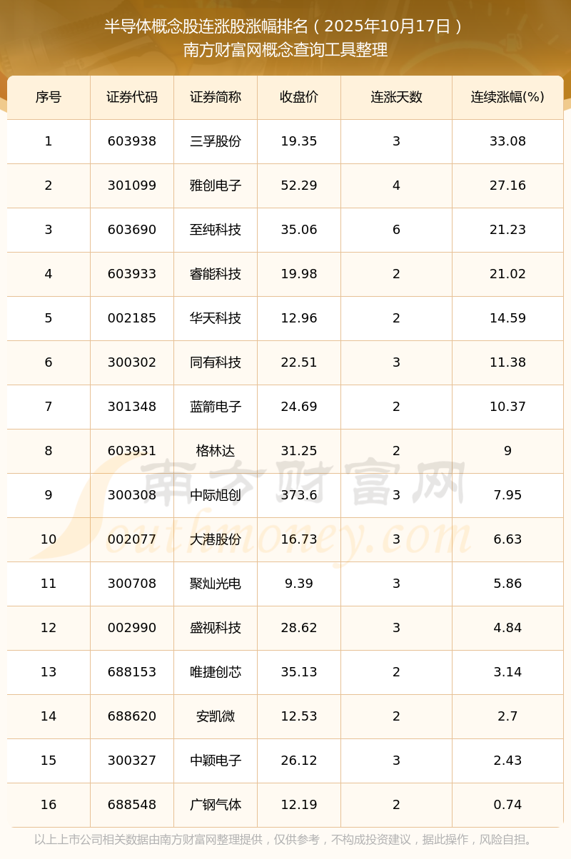 2025年10月17日半導(dǎo)體概念股連漲股漲幅排名