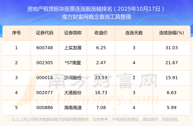 2025年10月17日房地產(chǎn)租賃板塊股票連漲股漲幅排名