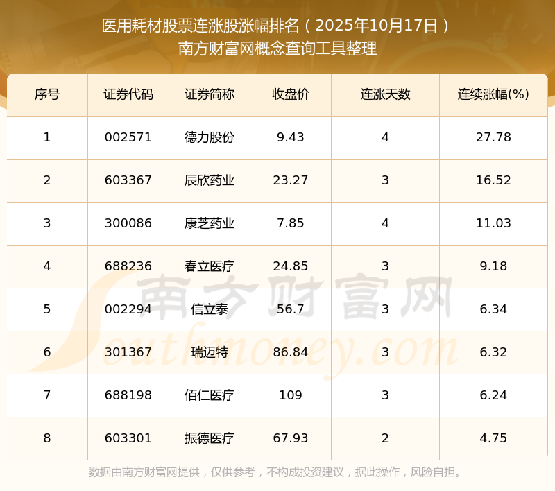 2025年10月17日醫(yī)用耗材股票連漲股票漲幅排名