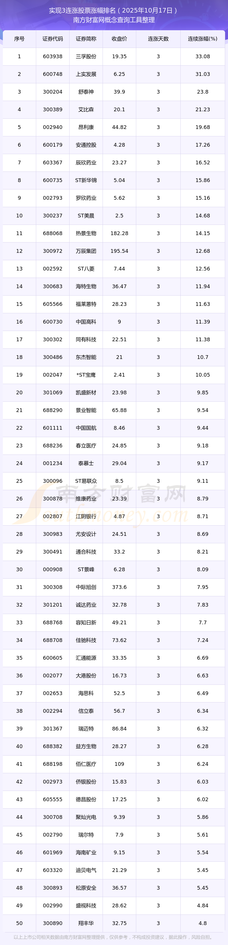 2025年10月17日實現(xiàn)3連漲股票漲幅排名