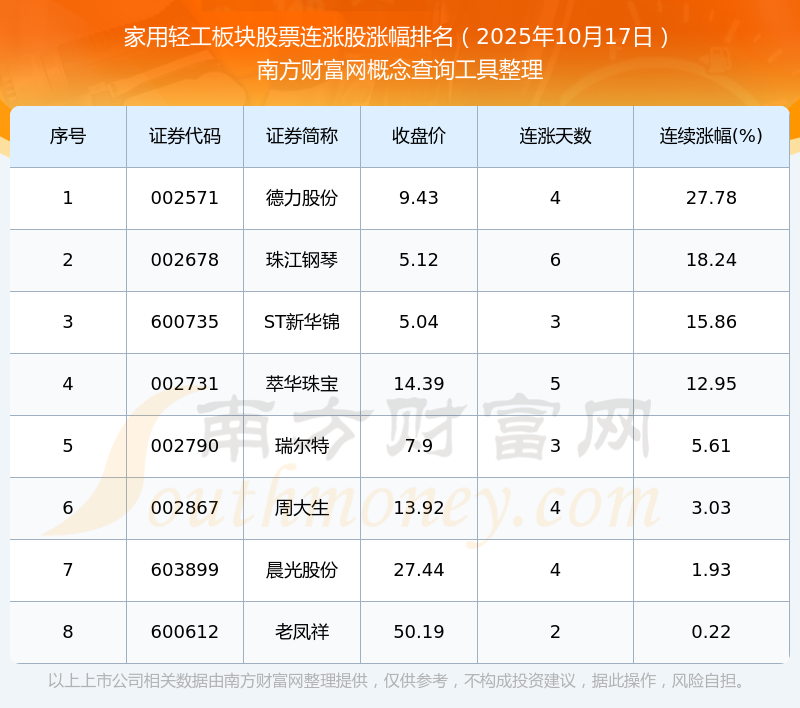 2025年10月17日家用輕工板塊股票連漲股漲幅排名