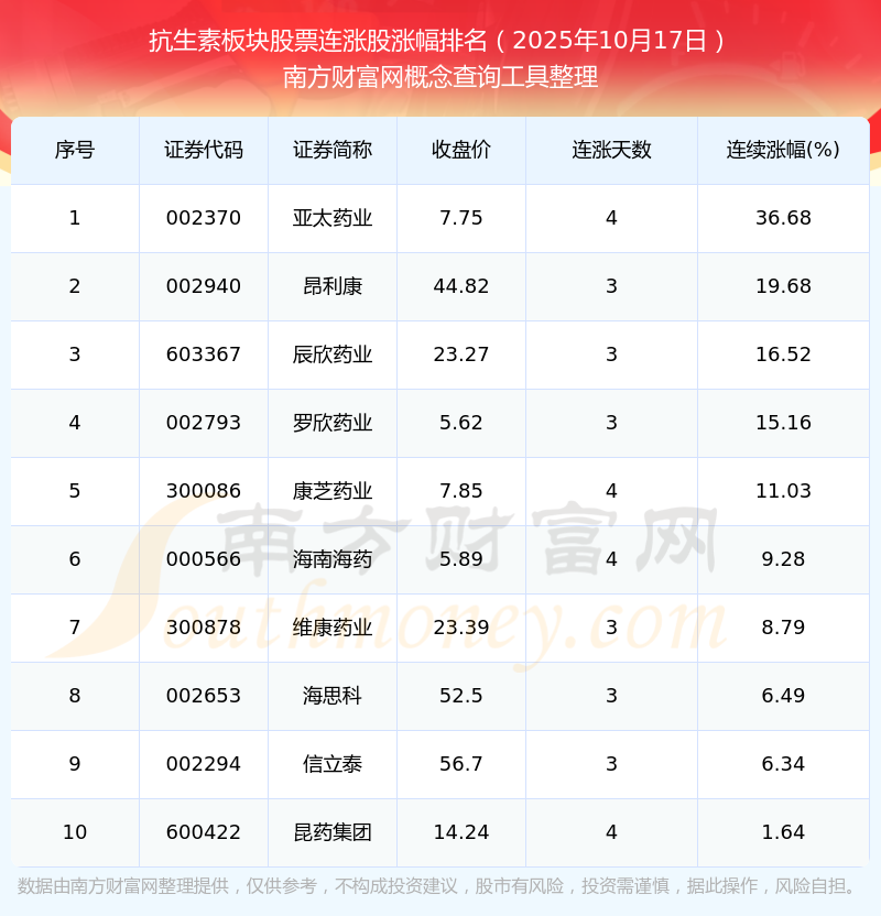 2025年10月17日抗生素板塊股票連漲股漲幅排名