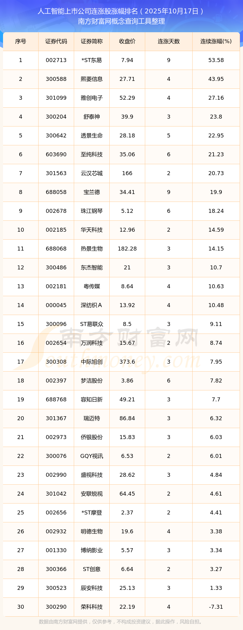 2025年10月17日人工智能上市公司連漲股漲幅排名