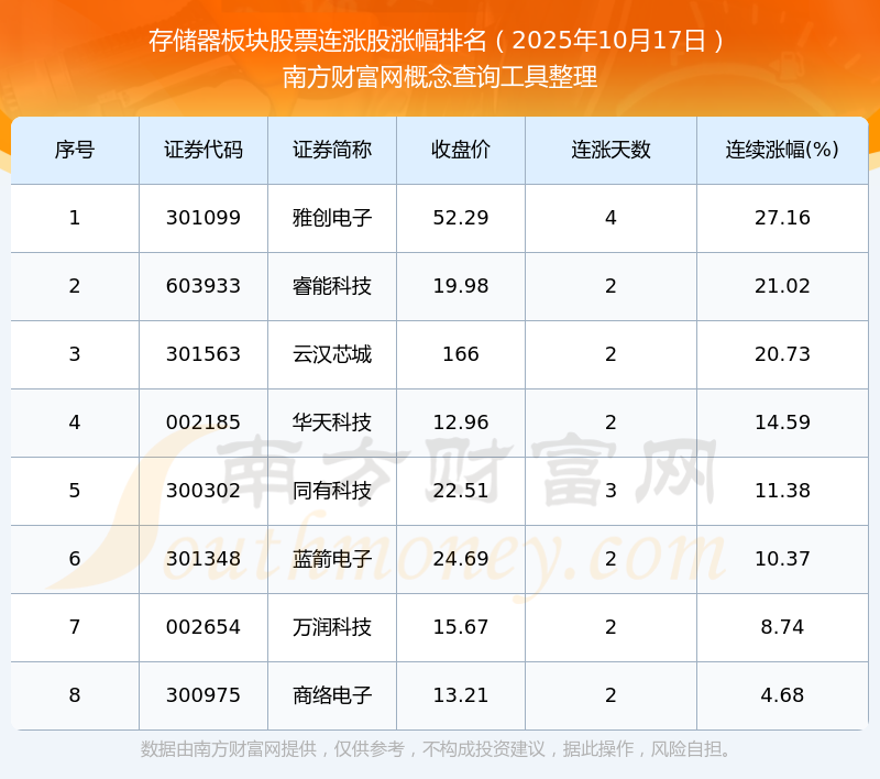 2025年10月17日存儲器板塊股票連漲股漲幅排名