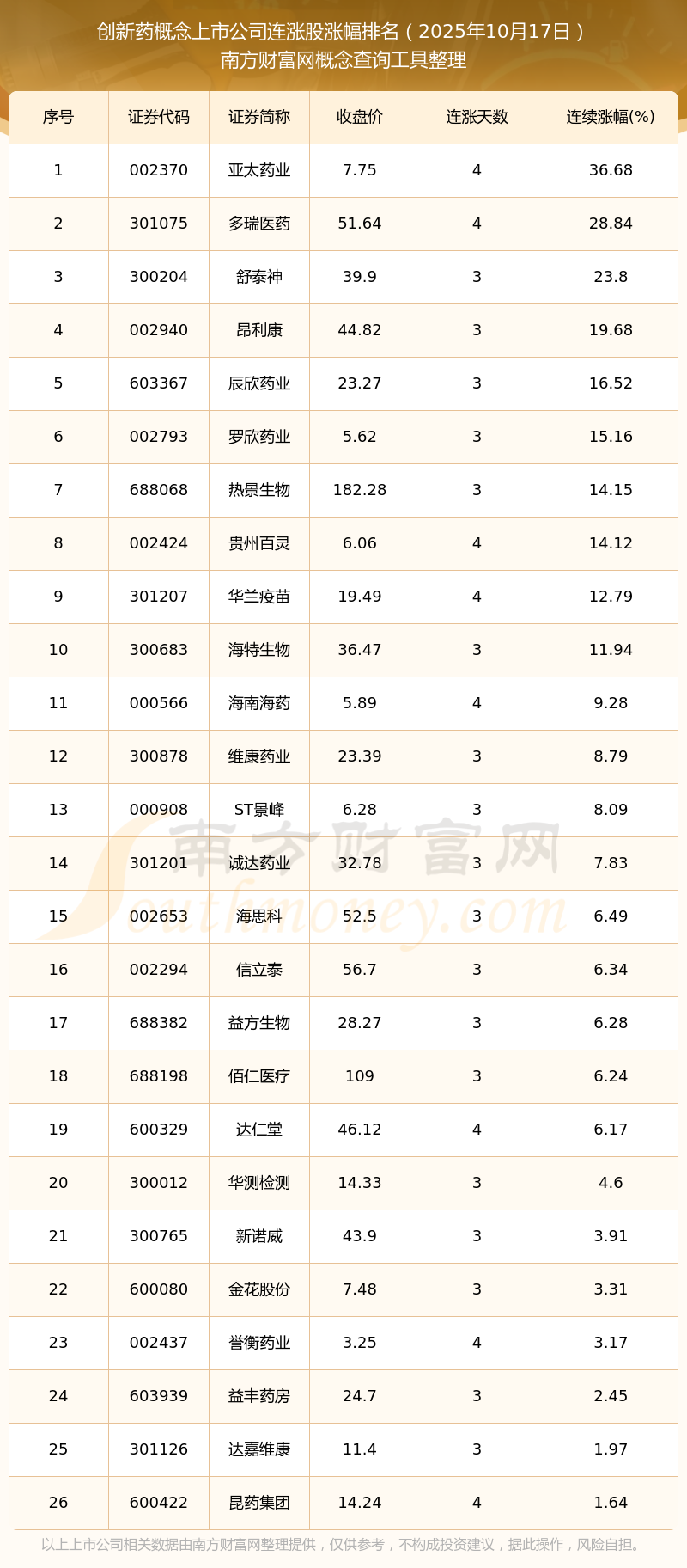 2025年10月17日創(chuàng)新藥概念上市公司連漲股漲幅排名