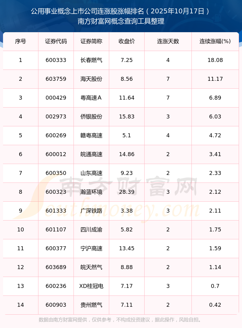 2025年10月17日公用事業(yè)概念上市公司連漲股漲幅排名