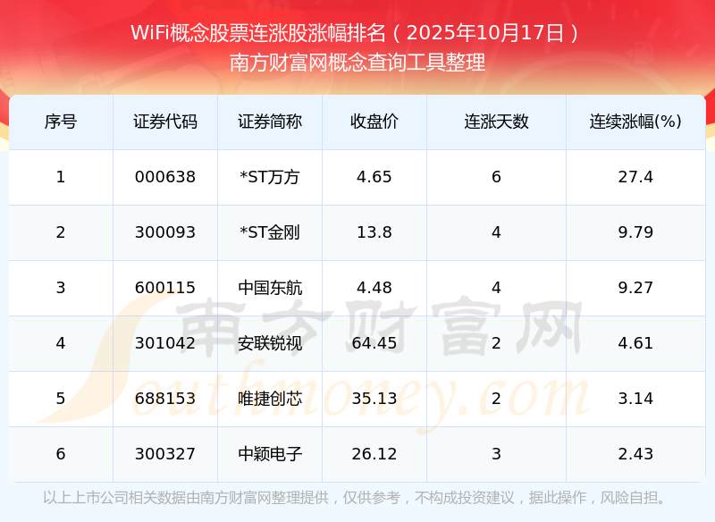 根據(jù)南方財富網(wǎng)概念查詢工具數(shù)據(jù)統(tǒng)計,截止2025年10月17日收盤,WiFi概念股票共有6只個股實現(xiàn)連漲。其中連續(xù)漲幅較大的個股有*ST萬方、*ST金剛、中國東航等,連續(xù)漲幅分別為27.40%、9.79%、9.27%。