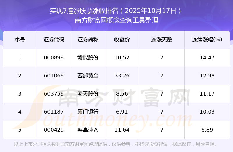2025年10月17日實(shí)現(xiàn)7連漲股票漲幅排名