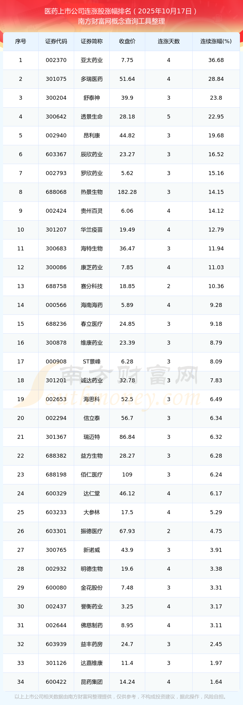 2025年10月17日醫(yī)藥上市公司連漲股漲幅排名