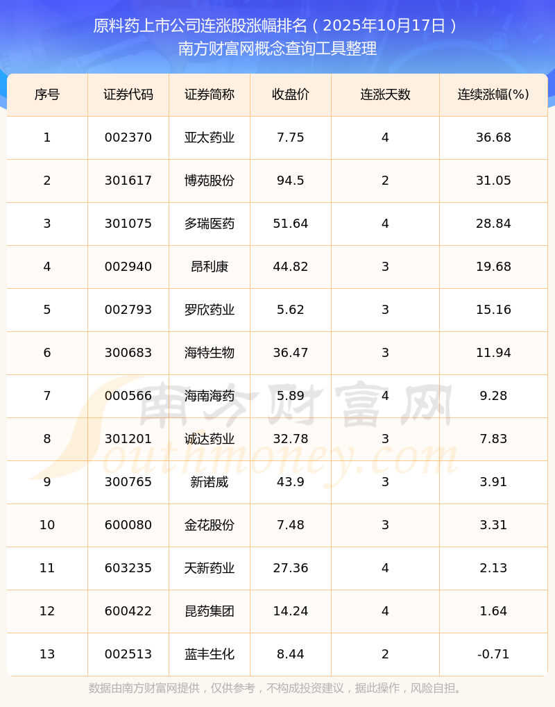 2025年10月17日原料藥上市公司連漲股漲幅排名
