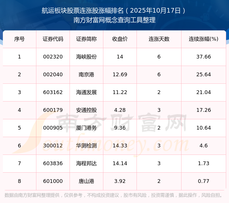 2025年10月17日航運板塊股票連漲股漲幅排名