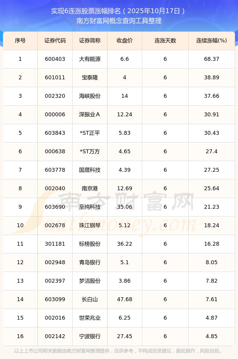 根據(jù)南方財(cái)富網(wǎng)概念查詢(xún)工具數(shù)據(jù)統(tǒng)計(jì),截止2025年10月17日收盤(pán),共有16只個(gè)股實(shí)現(xiàn)6天連漲。其中連續(xù)漲幅較大的個(gè)股有大有能源、寶泰隆、海峽股份等,連續(xù)漲幅分別為68.37%、38.89%、37.66%。