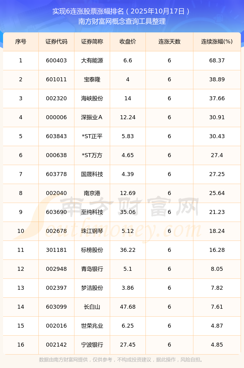 根據(jù)南方財(cái)富網(wǎng)概念查詢工具數(shù)據(jù)統(tǒng)計(jì),截止2025年10月17日收盤(pán),共有16只個(gè)股實(shí)現(xiàn)6天連漲。其中連續(xù)漲幅較大的個(gè)股有大有能源、寶泰? ⒑O抗煞蕕齲???欠?直鷂?68.37%、38.89%、37.66%。 2025年10月17日連漲6天的股票漲幅排名 數(shù)據(jù)由南方財(cái)富網(wǎng)提供,僅供