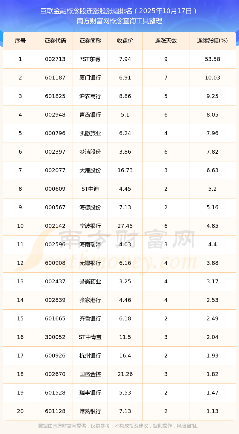 根據(jù)南方財富網(wǎng)概念查詢工具數(shù)據(jù)統(tǒng)計,截止2025年10月17日收盤,互聯(lián)金融概念股共有20只個股實現(xiàn)連漲。其中連續(xù)漲幅較大的個股有*ST東易、廈門銀行、滬農(nóng)商行等,連續(xù)漲幅分別為53.58%、10.03%、9.25%。