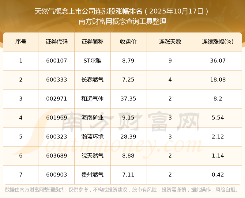 2025年10月17日天然氣概念上市公司連漲股漲幅排名