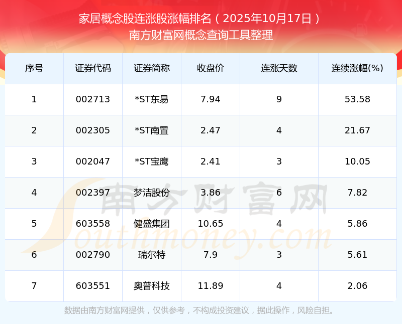 根據(jù)南方財(cái)富網(wǎng)概念查詢(xún)工具數(shù)據(jù)統(tǒng)計(jì),截止2025年10月17日收盤(pán),家居概念股共有7只個(gè)股實(shí)現(xiàn)連漲。其中連續(xù)漲幅較大的個(gè)股有*ST東易、*ST南置、*ST寶鷹等,連續(xù)漲幅分別為53.58%、21.67%、10.05%。