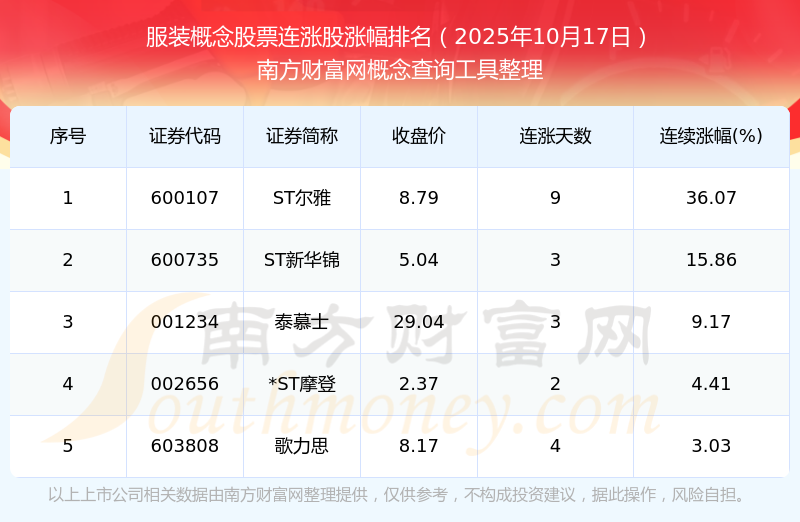 根據(jù)南方財富網(wǎng)概念查詢工具數(shù)據(jù)統(tǒng)計,截止2025年10月17日收盤,服裝概念股票共有5只個股實現(xiàn)連漲。其中連續(xù)漲幅較大的個股有ST爾雅、ST新華錦、泰慕士等,連續(xù)漲幅分別為36.07%、15.86%、9.17%。