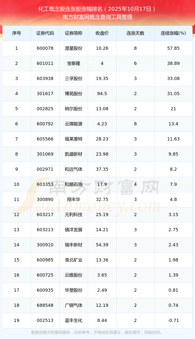 根據(jù)南方財(cái)富網(wǎng)概念查詢工具數(shù)據(jù)統(tǒng)計(jì),截止2025年10月17日收盤,化工概念股共有19只個(gè)股實(shí)現(xiàn)連漲。其中連續(xù)漲幅較大的個(gè)股有澄星股份、寶泰隆、三孚股份等,連續(xù)漲幅分別為57.85%、38.89%、33.08%。