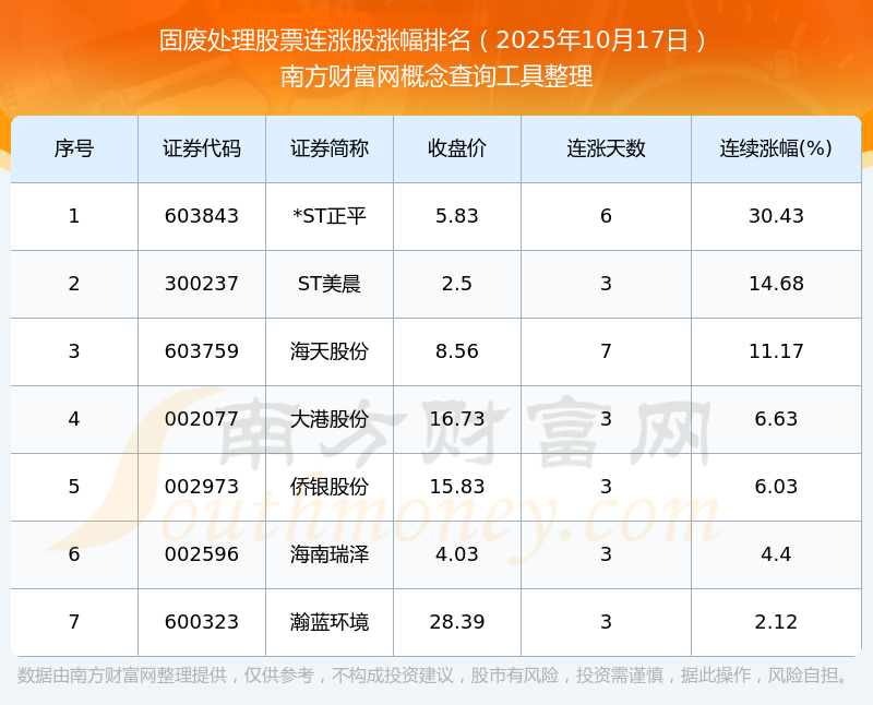 根據(jù)南方財富網概念查詢工具數(shù)據(jù)統(tǒng)計,截止2025年10月17日收盤,固廢處理股票共有7只個股實現(xiàn)連漲。其中連續(xù)漲幅較大的個股有*ST正平、ST美晨、海天股份等,連續(xù)漲幅分別為30.43%、14.68%、11.17%。
