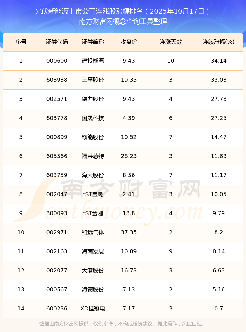 2025年10月17日光伏新能源上市公司連漲股漲幅排名