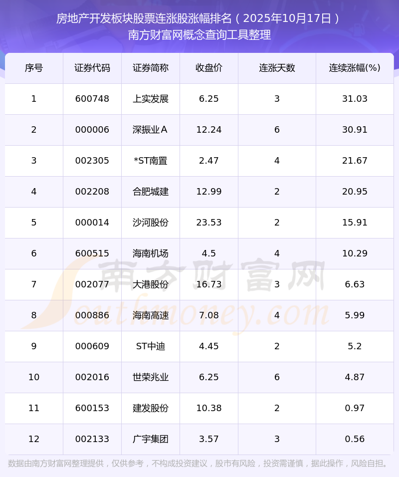 2025年10月17日房地產(chǎn)開發(fā)板塊股票連漲股漲幅排名
