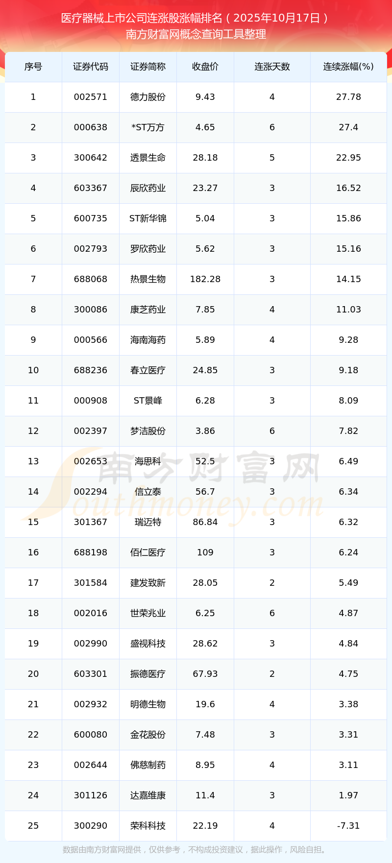 2025年10月17日醫(yī)療器械上市公司連漲股漲幅排名