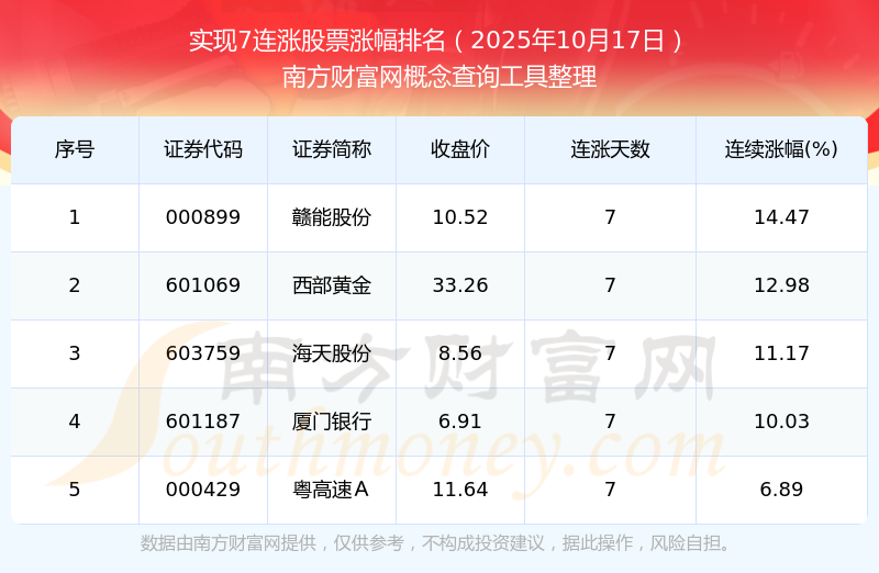 根據南方財富網概念查詢工具數據統(tǒng)計,截止2025年10月17日收盤,共有5只個股實現7天連漲。其中連續(xù)漲幅較大的個股有贛能股份、西部黃金、海天股份等,連續(xù)漲幅分別為14.47%、12.98%、11.17%。