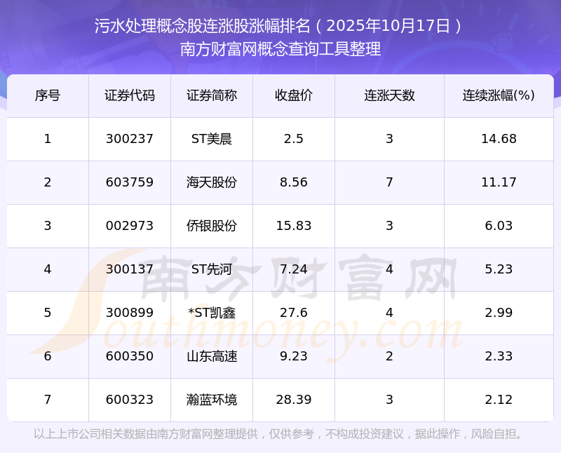 2025年10月17日污水處理概念股連漲股漲幅排名