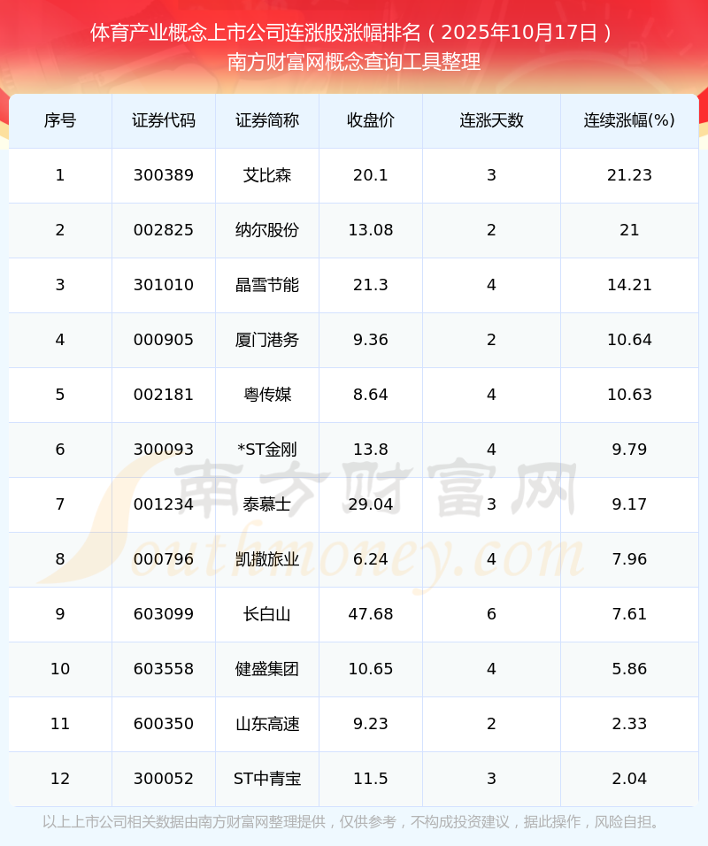 2025年10月17日體育產(chǎn)業(yè)概念上市公司連漲股票漲幅排名