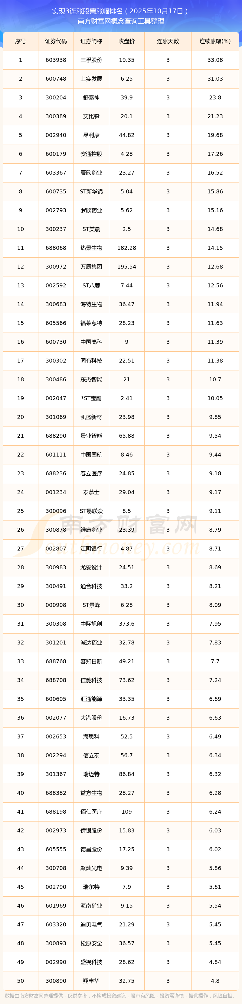 2025年10月17日實(shí)現(xiàn)3連漲股票漲幅排名