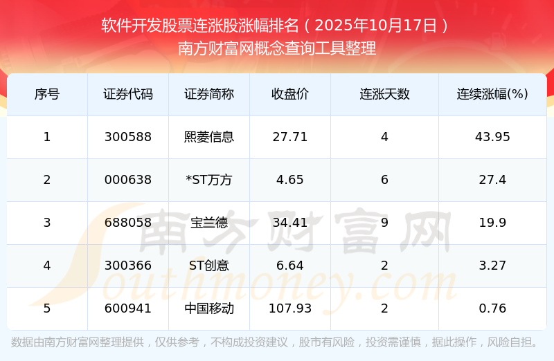 2025年10月17日軟件開發(fā)股票連漲股漲幅排名