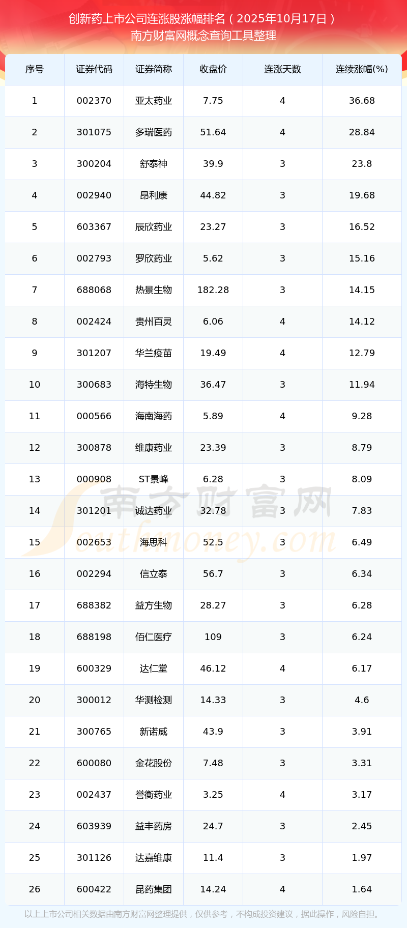 2025年10月17日創(chuàng)新藥上市公司連漲股漲幅排名