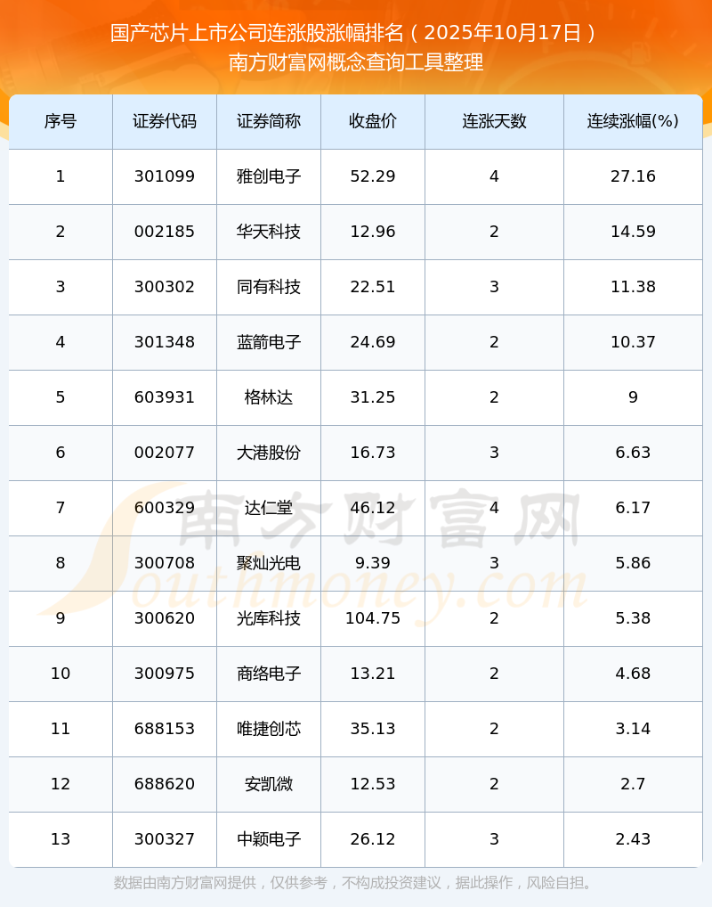 根據(jù)南方財富網(wǎng)概念查詢工具數(shù)據(jù)統(tǒng)計,截止2025年10月17日收盤,國產(chǎn)芯片上市公司共有13只個股實現(xiàn)連漲。其中連續(xù)漲幅較大的個股有雅創(chuàng)電子、華天科技、同有科技等,連續(xù)漲幅分別為27.16%、14.59%、11.38%。