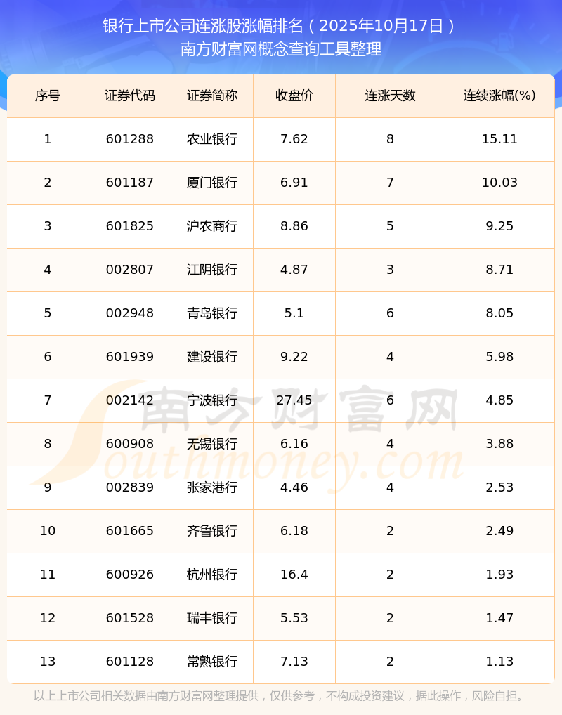 2025年10月17日銀行上市公司連漲股漲幅排名
