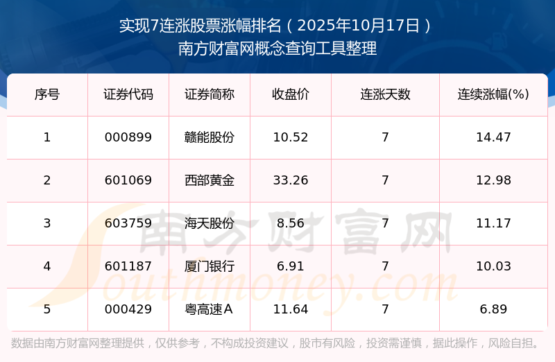 2025年10月17日實(shí)現(xiàn)7連漲股票漲幅排名