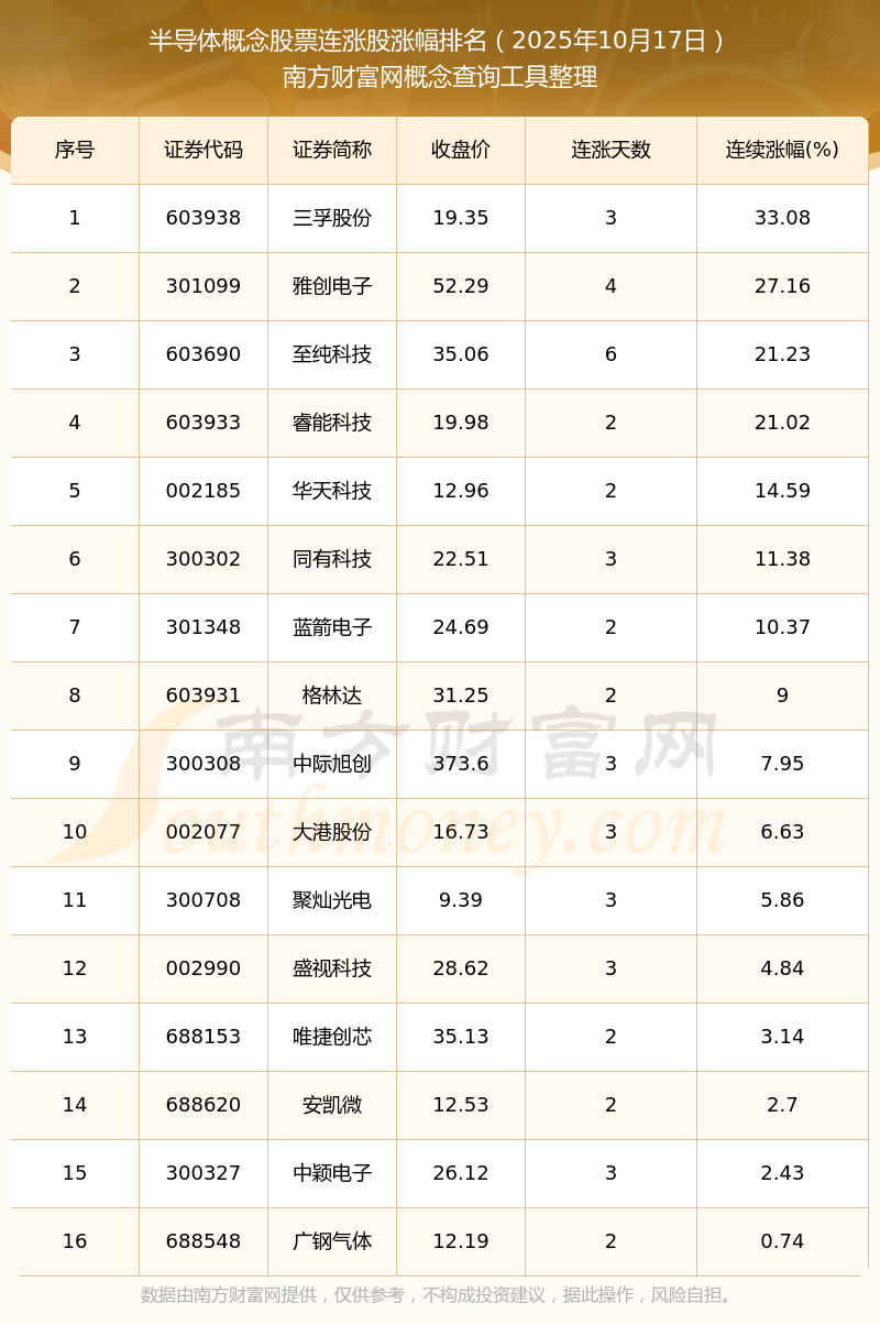 2025年10月17日半導(dǎo)體概念股票連漲股漲幅排名